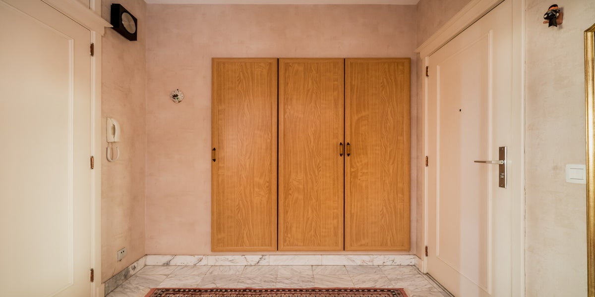 - Inkomhal met ingebouwde kasten die als vestiaire dienst doet en schoenenberging met zolderkast.