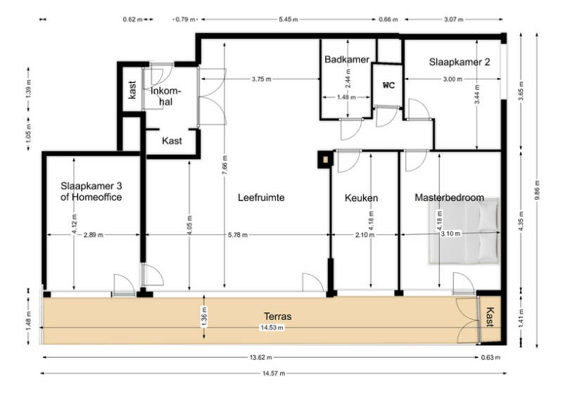 - 3 volwaardige slaapkamers (ca. 14 m², 13 m² en 11 m²) – ideaal voor gezin, extra logeerkamer of home office.